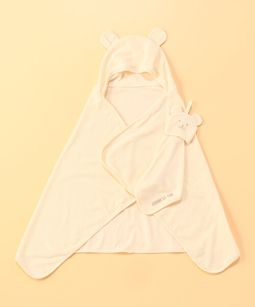 耳付きのフードが付いた、大判のタオルです。(タテ57cm×ヨコ106cm)