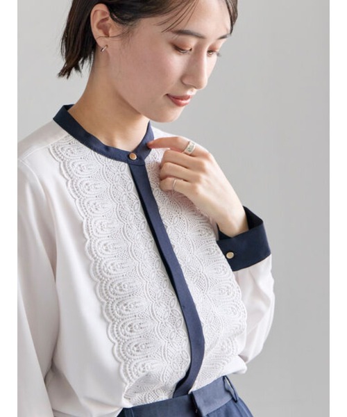 フロントの繊細なスカラップレースが上品で洗練された雰囲気を演出するブラウス。
