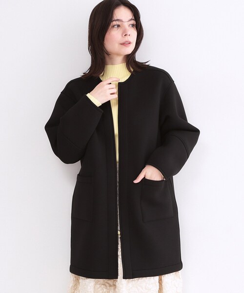 ・シンプルなノーカラーで、クルーネックデザインのミドル丈コート。