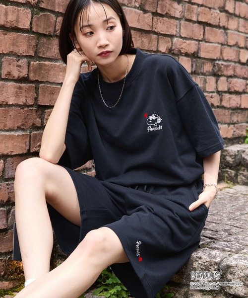 参考商品名:【PEANUTS / SNOOPY】別注 ピーナッツ スヌーピー セットアップ ワンポイントハート刺繍 オーバーサイズ 半袖プルオーバースウェット&ショートパンツ
