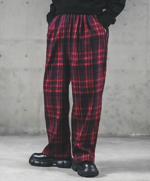 キーワード:パンツ メンズ ウエストゴム クロップド ストレート チェック ハイウエスト ワイドパンツ