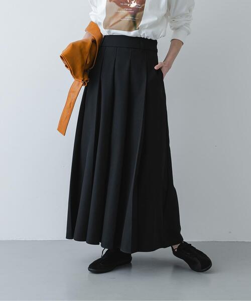 【春の装いをスマートに。花粉ガードプリーツスカート】・花粉ガードを施したきれいめなポリエステルツイル素材で、春の外出も安心