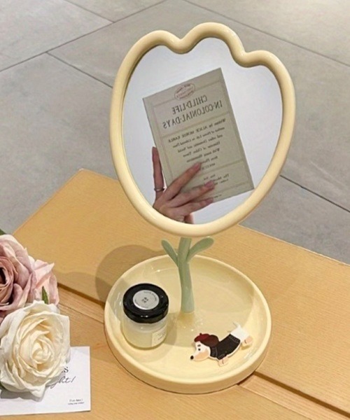 チューリップのフォルムがかわいい、小物置き付きの卓上ミラー。