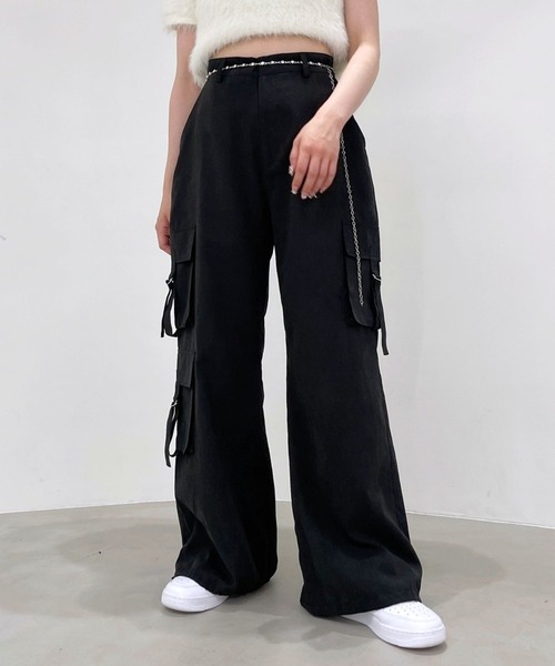 キーワード:カーゴパンツ レディース ストレート ハイウエスト フルレングス ワイドパンツ 無地