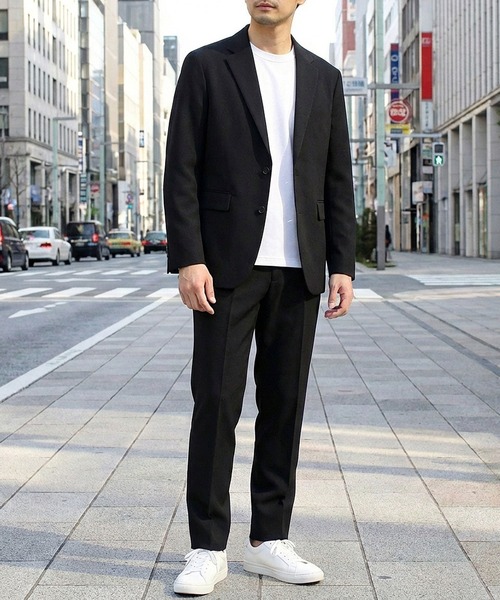 トラディショナルな2ボタンタイプのテーラードジャケットとパンツのスーツセットアップ