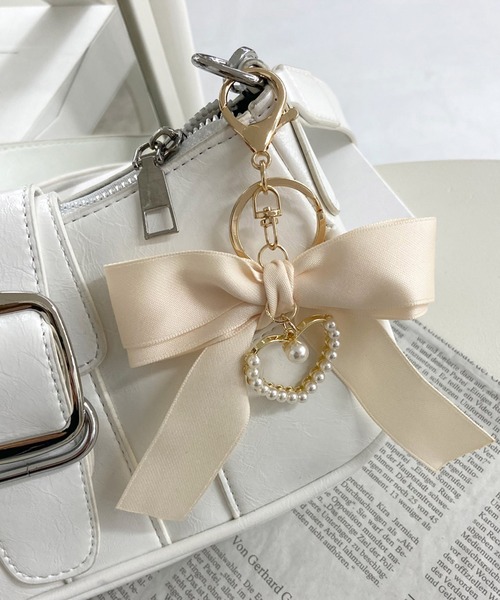 垂れ下がったフェイクパールハートモチーフと立体的なリボンモチーフが春服から夏服コーデに可愛いチャームストラップ。