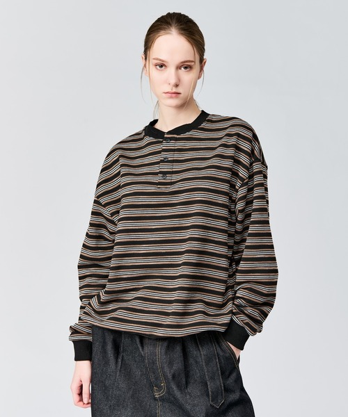フロントのヘンリーネックがアクセントになったボーダーロンT。