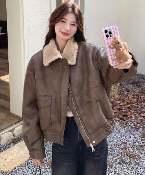 フェイクレザージャケット/ボア付き