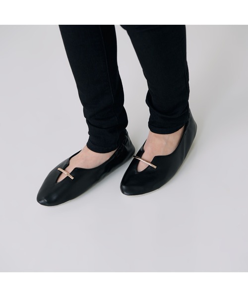 合皮×金属プレートで、まるで外履きのようなデザイン。