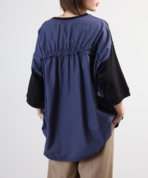 OE天竺ジャージ×布帛の異素材コンビが魅力的なシャーリング入りチュニックブラウス