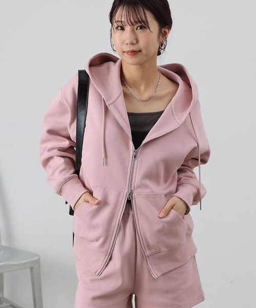 同素材のボトムスとセットアップとして合わせるスタイルもオススメです。