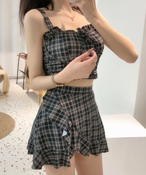 Y2K チェック柄 フリルデザインフロントクロス スカートビキニ 水着が登場♪