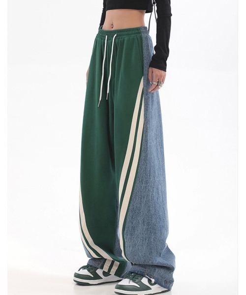 パンツ/ワイドパンツ/スウェットパンツ/イージーパンツ/サイドライン/ラインパンツ/切り替えデザイン/異素材/ドッキングパンツ/ワイドシルエット/ルーズシルエット/ゆったり/ストリート/韓国ファッション/メンズライク/カジュアル/スポーティ/ウエストゴム/リラックス/体型カバー/トレンド/オールシーズン