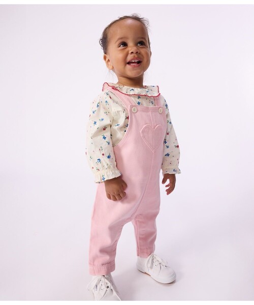ハート型のパッチポケットが目を引くサロペットです。ボタン付きショルダーストラップが施されているので、おむつ替えやお着替えも簡単。飽きのこないシンプルなデザイン、デイリーで着られる動きやすさを重視したおすすめアイテムです。※1.濃色の製品は、摩擦や洗濯の際に色落ちや色移りをする場合があります。中性洗剤で単独洗いをしてください。