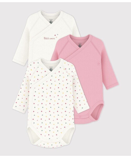 シンプルなプレーンカラーと人気のハート柄、メッセージプリントを揃えた長袖あわせボディ3枚セットです。お着替えがしやすいよう、スナップボタンが施されているので外出時も安心。何枚あっても嬉しいアイテムは、出産祝いなどのギフトにもおすすめです。※1.プリントは永久的なものではなく、もみや摩擦でひび割れたり、繰り返しの洗濯によるプリントの変色や、脱落が生じる場合があります。中性洗剤などで単独洗いをしてください。