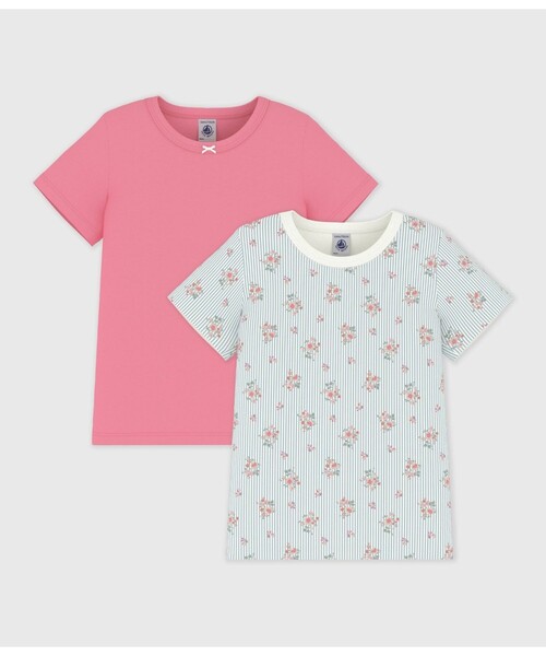 ストライプ地にのせたフラワープリントと合わせやすいプレーンカラーを揃えた半袖Tシャツ2枚セットです。首元リボンとピコレースがデザインのポイント。インナーとしても、これ一枚でも活躍する何枚あっても嬉しいアイテムは、ご自宅での使用はもちろん、特別なギフトとしてもおすすめです。揃い柄のショーツとセットアップも可能。※1.プリントは永久的なものではなく、もみや摩擦でひび割れたり、繰り返しの洗濯によるプリントの変色や、脱落が生じる場合があります。中性洗剤などで単独洗いをしてください。