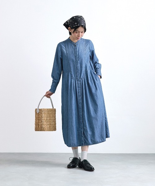 ライトオンスのスラブデニムを使い、しっかりと洗いをかけて色褪せさせ、こなれた風合いのすっきりとしたワンピースに仕上げた「ブザムが長いデニムワンピース」。