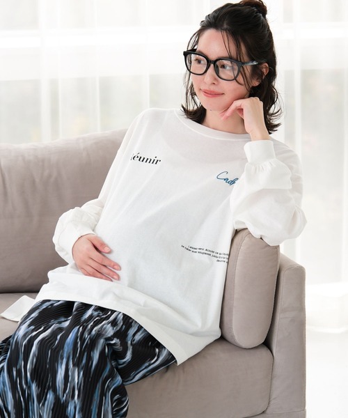 お腹が大きくなっても着用できるプリントTシャツです。ヒップ回りが隠れるくらいの着丈で安心感もあります!
