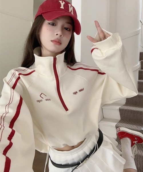 【配色ラインがアクセント!韓国トレンド感のあるハーフジップショート丈プルオーバー】