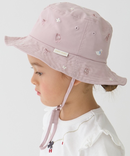 刺しゅうの総柄が可愛らしいバケットハットのデザインを引き立てるよう、ふわっとしたワンピースやシンプルなパンツに合わせるのがおすすめ。