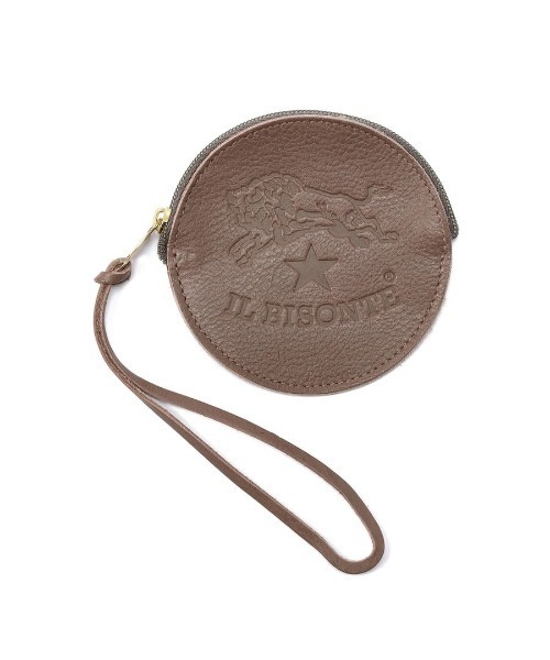 ブランドロゴが大きく刻印されたラウンドフォルムのストラップつきコインパース。