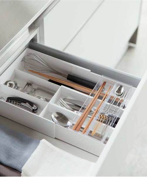 伸縮式下段トレーにはフォークやナイフだけではなく、菜箸やフライ返しといった長いキッチンツールも収納できます。