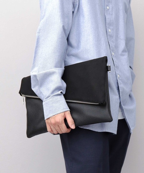 斜めに切り替えられたフラップデザインが、モードな雰囲気のクラッチバッグ。程よい艶感のレザー調素材のボディに、異素材のフラップを合わせた、一癖あるデザイン。フラップ部分は、マットな質感のピーチスキン素材と、滑らかな質感のスムース素材の選べる2種類。斜めに切り替えたフラップデザインとメタルジップが、リッチな素材を引き立て、モードな雰囲気に。クラッチバッグとしては珍しい、A4が収まるやや大きめのサイズ感。付属のショルダーストラップは、ボディの同素材を贅沢に使用。普段のカジュアルスタイルからキレイめスタイルまで幅広く合わせられるクラッチバッグ。