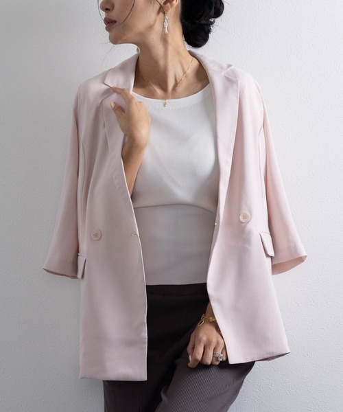 メンズライクになりがちなダブルボタンのジャケットも、柔らかな素材感やワイドな袖で女性らしい雰囲気に。