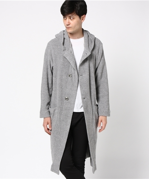 ノンツイストパイルの名前のごとく、撚り(ねじること)のない糸を使用し、綿が本来持つ柔らかさを最大限に生かすことのできるローゲージ編みのパイル素材を使用し,大きめのフードとボリューム感で、身体全体を包み込むようなゆったりとしたデサインのROOM ROBE。部屋でのリラックス感を意識したバスローブのような1枚。