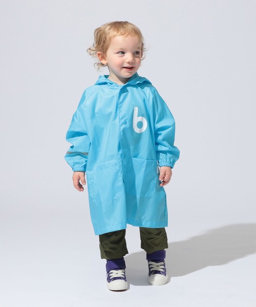 雨の日の登園・通学も快適に!!雨や雪の日に大活躍の人気レインコートです!撥水仕様の生地を使用。背中にタブボタン付きのボックスプリーツを設けているので、ランドセルやリュックを背負ったままでもスマートに羽織れます。ゴム内蔵のフードは視界を広く保てて、風の強い日にも安心。持ち運びに便利なポーチが付いているので持ち運びや保管にも大変便利です。左胸には「b」ロゴでアクセントを加え、右腕袖口にはリフレクターラインを施して視認性を高めています。