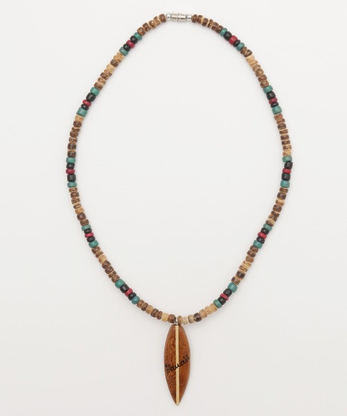 クラシックなサーフボード型ヘッドがポイントのメンズネックレス。ココナッツビーズでカジュアルなサーフスタイルに◎