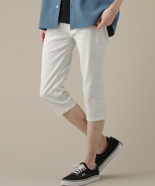 汗ばむ季節には丈の短いパンツが欲しいところ。とは言え、いくら暑くてもショートパンツほど脚を露出するスタイリングには抵抗がある…という方も多いのではないでしょうか。そんな方におすすめなのが膝下丈で作られたクロップドパンツです。こちらのクロップドパンツはテーパードシルエットを採用し、裾の広がりを最大限抑えて完成させました。裾が広がらないことで脚のラインがキレイに出て、美脚見えするパンツとなっております。