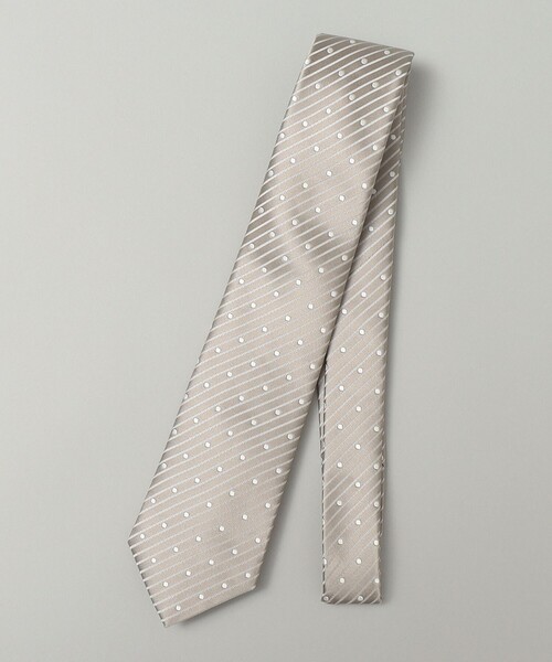 サテン織特有の艶やかさと、立体感のあるドビードット/ストライプ柄が上品な印象を与えるネクタイです。