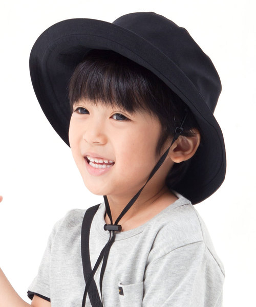 キッズサイズにアレンジしたつば広のUVハット。取り外し可能な顎紐附属。小さくたたんで左横のフラップでコンパウトになる仕様。