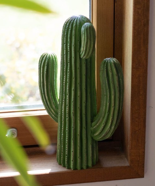 ショップのアイコンになり得る存在感のサボテンサボテンに癒しを憶えるのは、マイナスイオン効果とか、グリーンの色の効果などと言われますが、ある種人間的なフォルムにも心をほぐす理由がある様に感じます。こちらはもちろんフェイクのサボテンですが、思わず撫でたくなる愛らしさと、空間を彩る絶大な存在感たっぷりです。
