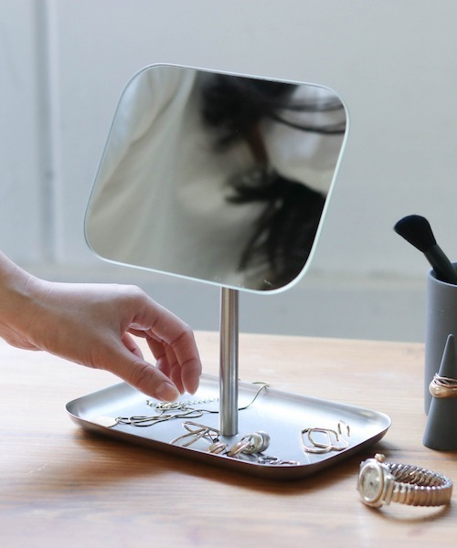 毎日が、少しだけ快適になるかもしれない鏡の前で毎日すること。メガネをかける。ピアスを付ける。ネックレスを付ける。前髪にクシを通す。リップクリームをつける。口紅を塗る。だから、鏡にトレイを付けました。ほろ酔いのバーで会ったあの人の名刺も、ここに置いておけば忘れません。あなたの毎日が、より愛すべき毎日になります様に。
