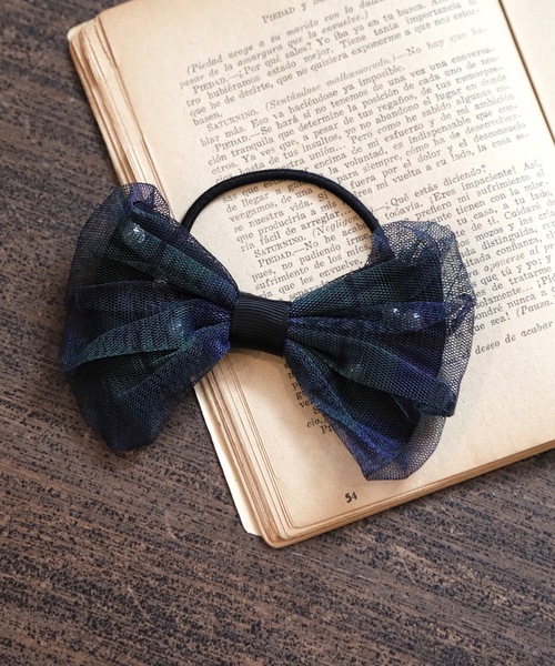 パール入りのスイートトラッド感たっぷりリボンゴムパールを散りばめたコットンリボンを、さらにふんわりとチェック柄のチュールで包み込みました。