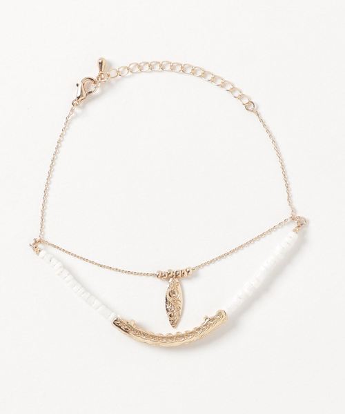 ハワイアンジュエリー調の模様が刻まれたサーフボードチャームとチューブパーツがポイント。爽やかなカラービーズと組み合わせた2連アンクレット。足元を上品に彩ります。ブレスレットとしてもお使いいただけます。