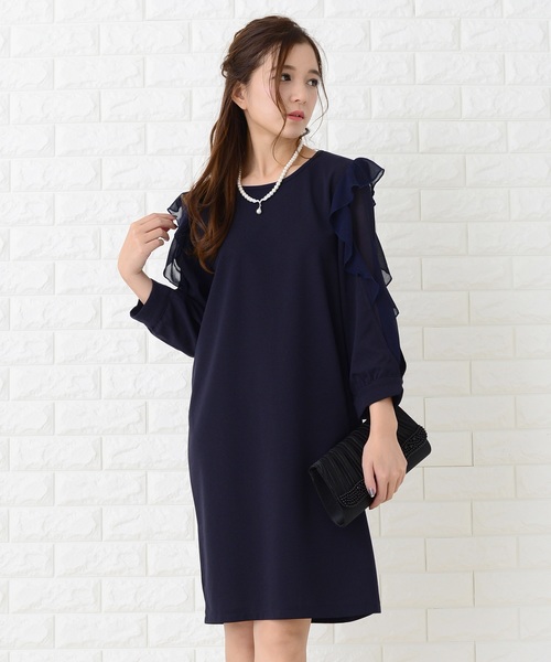 シースルーフリル長袖膝丈ドレス・ワンピース