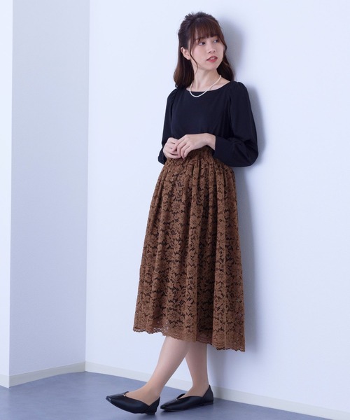 (2)ワンピの下にスカートを合わせれば、裾からレースがチラ見えする上品なレイヤードスタイルに早変わり。