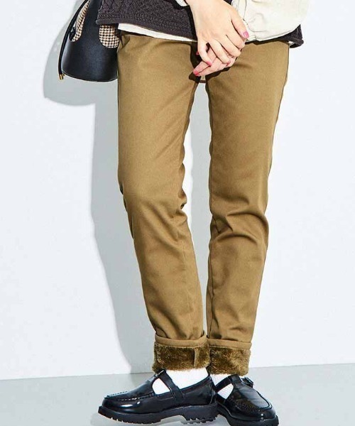 毎日頼れるあたたかさ スッキリ見えストレート生地の裏側に防風コーティングしたストレッチ素材に、ふわふわボアがみっしり。