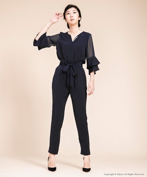 フレアスリーブトップス & ウエストタックパンツスーツ落ち感のあるとろみ素材を贅沢に使った、シルエット自慢のパンツスーツ!