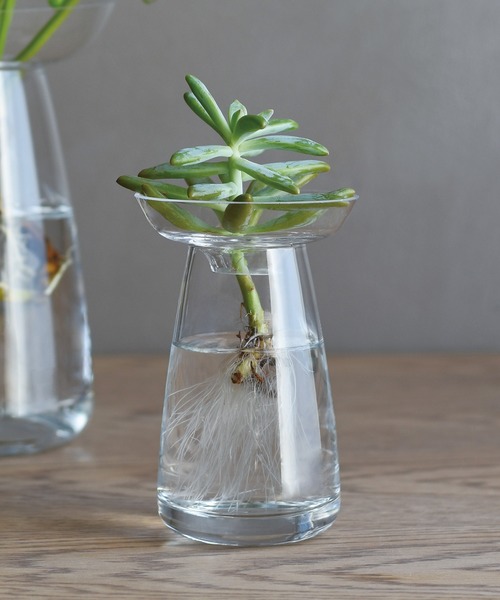植物が水の中で育っていく美しい過程を愉しむことをコンセプトに開発された花器。お皿が取り外しできるのでお手入れや水替えも簡単です。多肉植物やサボテンなど繊細な観葉植物には直接触れることなく、水の交換ができます。球根や多肉植物などの水栽培の他、お花を入れて花瓶としてもお使いいただけます。