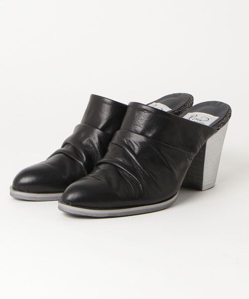 自然なシワ出しの優しいフォルムの深ミュール。足首際までの深さがあり、甲のホールド感が良く、更にブーツ的な見え方で履けます。70mmヒールですが太目で安定感があり、仕立ての柔らかさにふんわり履ける作りになっています。BL,OWはソフトな牛革。PTはクラッキング加工を施した鈍い光のメタリックレザーになります。