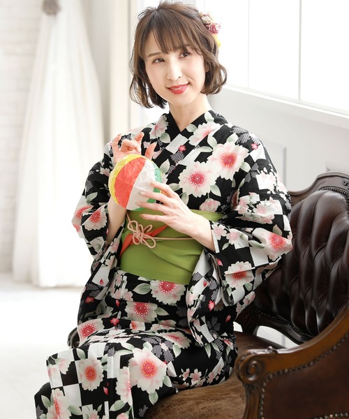 ブラック×ピンク:レトロ空色椿 3点セット【浴衣+半巾帯+下駄】レディース 浴衣