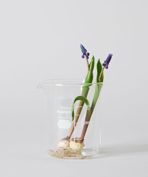 花器できちんとお花を飾るのも素敵ですが、実験器具など、用途の違うアイテムを使って飾るとお部屋に抜け感が生まれます。