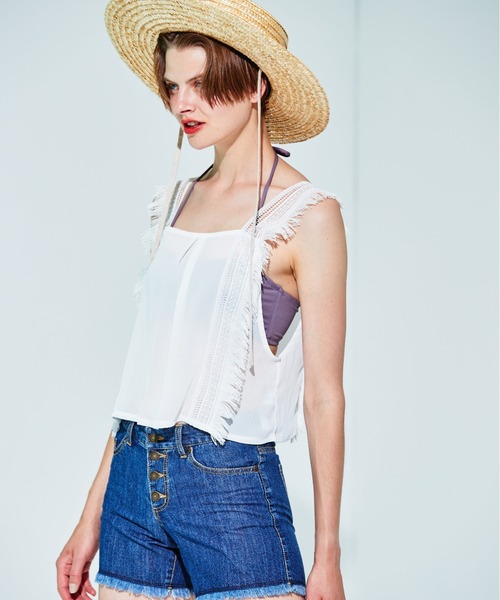 肩紐に使用したフリンジレースが甘すぎず、フェミニンにもシンプルにもあわせ易いです。