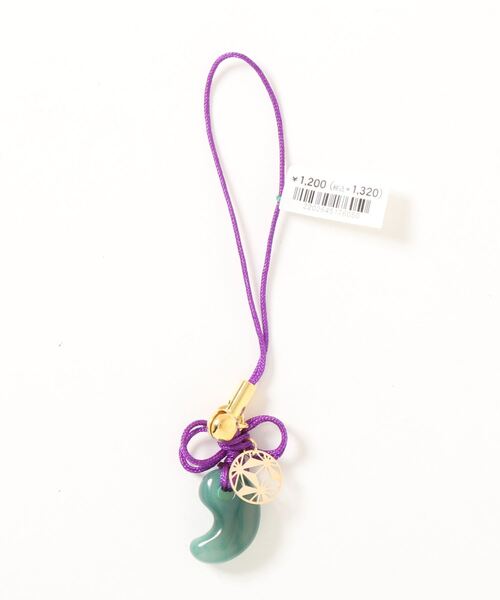 天然石の勾玉(まがたま)と吉祥紋の透かしチャーム、二重叶結びを組み合わせたストラップ。