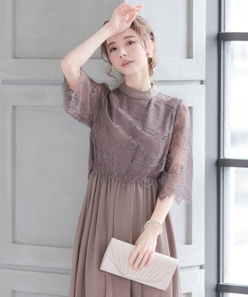ケープ風に見えるレーストップスが可愛らしいミディ丈のパーティードレス。