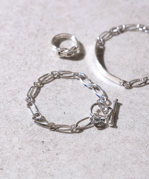 コーディネートの仕上げにメキシコのハンドメイドジュエリー<XOLO(ショロ)>からシルバー素材のブレスレットが登場。単品でのコーディネートはもちろんですが、シンプルなデザインで手持ちのアクセサリーと重ね付けもオススメです。着脱しやすいトグル状の留め具も上品な雰囲気が漂います。シーズンレスで身に着けるアイテムとして、ギフトにもお誂え向きの1品です。